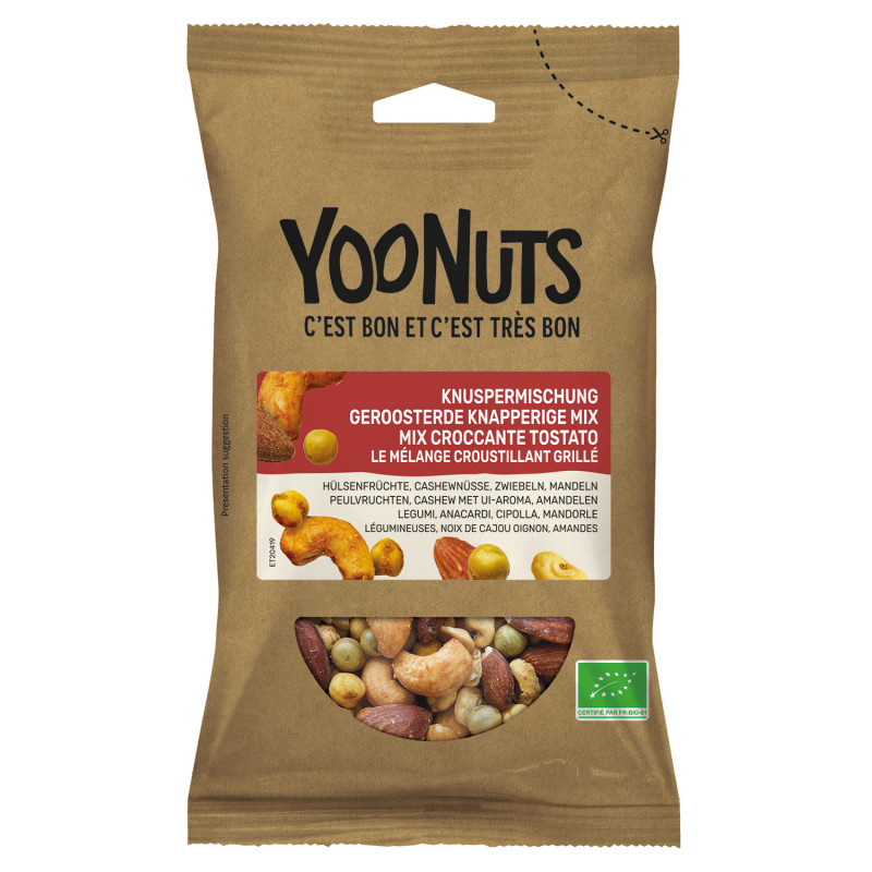 Ingredienti: Legumi arrostiti* [(fave* e piselli*), olio di girasole*, antiossidante : estratto di rosmarino*], ANACARDI arrostite e salate con cipolla* (ANACARDI*, cipolla* 3%, sale), MANDORLE sgusciate arrostite e salate* (MANDORLE* 98%, sale), ceci arrostiti* gusto hummus [ceci* 90%, destrosio*, sale, preparazione di aglio* (aglio*, sale), spezie in polvere* (cumino*, coriandolo*, curcuma*)]. * Prodotto da agricoltura biologica